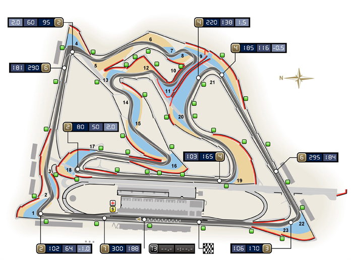 Широкое полотно, обилие высоко- и среднескоростных поворотов и, как следствие, острая борьба на первом этапе чемпионата, с большим количеством обгонов в конце прямой старт-финиш. Из-за того, что трасса расположена в пустыни, полотно часто бывает пыльным,что означает плохое сцепление и риск разворота. Огромное значение имеет тактика на гонку и тактика плановых пит-стопов.